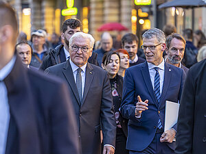 Bundespräsident Frank-Walter Steinmeier und Bürgermeister Geier im Gespräch auf dem Weg zur Andacht
