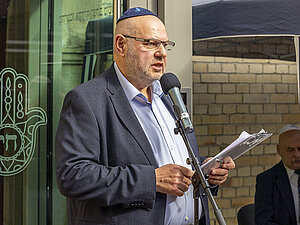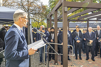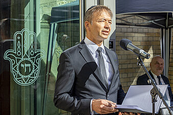 Dr. Felix Klein, der Beauftragte der Bundesregierung für jüdisches Leben in Deutschland und den Kampf gegen Antisemitismus, beim Gedenken im Hof der Synagoge