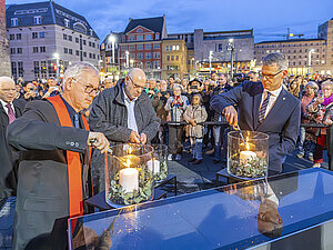 Nach der Andacht auf dem Marktplatz: Superinendent Hans-Jürgen Kant, der Vorsitzende der Jüdischen Gemeinde zu Halle, Max Privorozki, und Bürgermeister Egbert Geier entzünden Kerzen des Gedenkens.