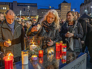 Viele Hallenserinnen und Hallenser stellten nach der Andacht Kerzen am Geosdeskop auf dem Marktplatz ab.