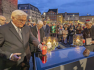 Bundespräsident Frank-Walter Steinmeier, der Präsident des Zentralrats der Juden in Deutschland, Josef Schuster, und der Landesbischof der Evangelischen Kirche in Mitteldeutschland, Johann Friedrich Kramer, (von links) entzünden Kerzen.