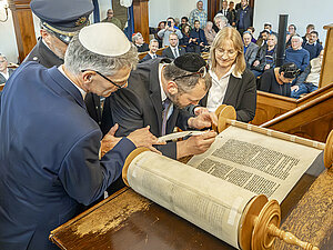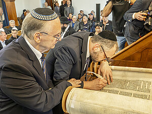 79.980 Wörter und 304.805 Buchstaben handgeschrieben: Die Jüdische Gemeinde Halle hat eine neue Tora-Rolle erhalten. Bürgermeister Egbert Geier und die Beigeordnete für Kultur und Sport, Dr. Judith Marquardt, beim Eintragen der letzten Buchstaben.
