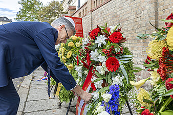Bürgermeister Egbert Geier an den Gedenkkränzen vor der Synagoge