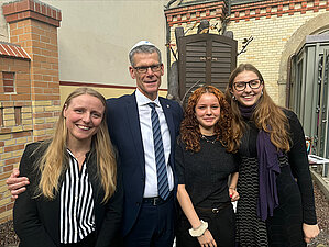 Schülerinnen und Schüler der Saale-Schule sammelten im Rahmen eines Projektes mehr als 1000 Euro für die Jüdische Gemeinde zu Halle. Stellvertretend für die Schülerinnen und Schüler übergaben Carolin Perling (links) sowie Annemarie Oelke und Martha Adelberg die Spende. Bürgermeister Egbert Geier lobte das Engagement.