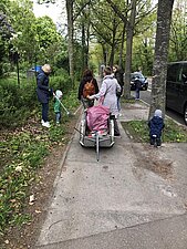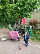 Kinder und Anwohner vom Gestüt Kreuz sammeln Müll in umliegenden Straßen.
