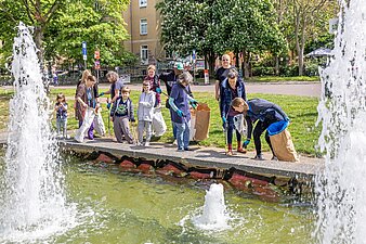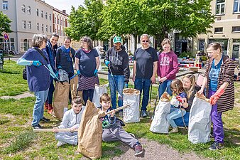 Anwohnern und Vereinsmitgliedern bewahrtESgut e. V. sammeln rund um den August-Bebel-Platz Müll ein.