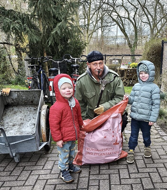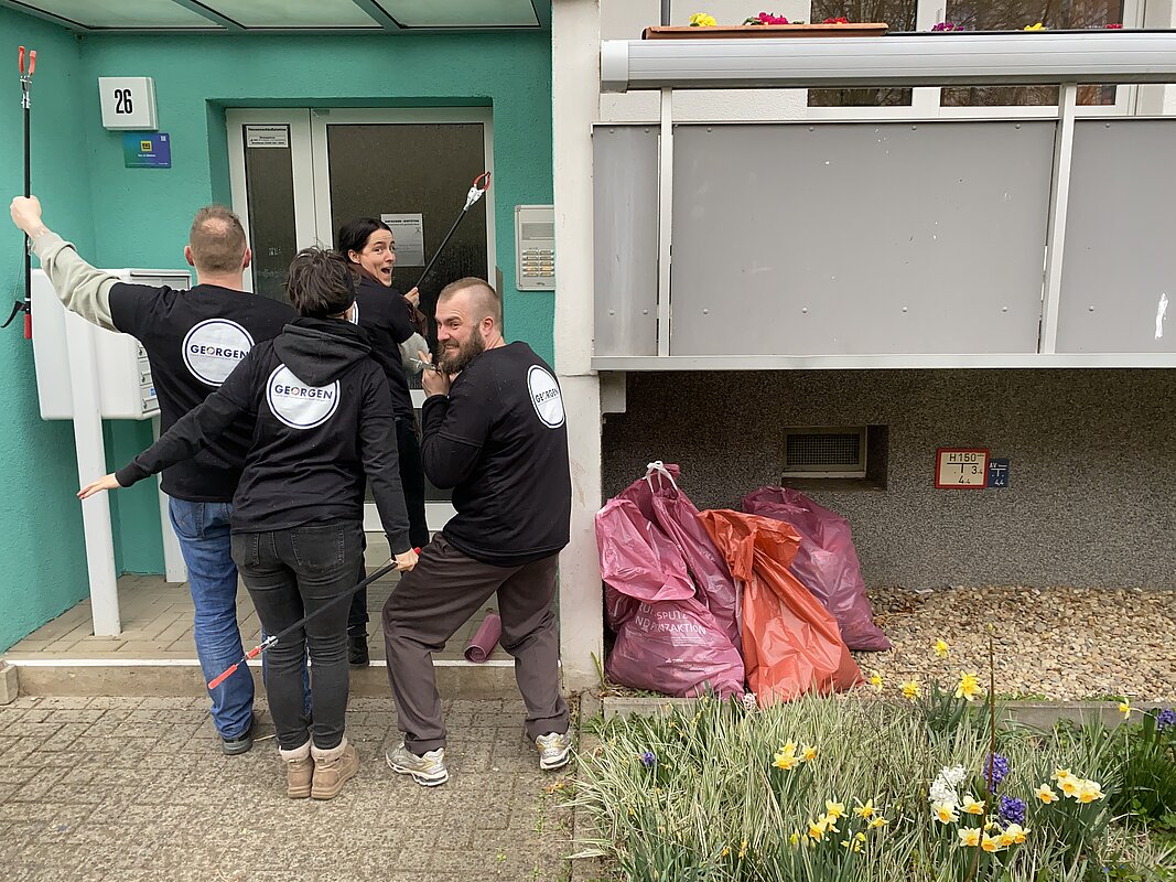 Die Mitarbeitenden vom Projekt „go!Halle Jugendbüro West“ haben am 25.03.2026 zusammen mit weiteren Helfern die Grünflächen in der Hyazinthenstraße von Müll befreit.