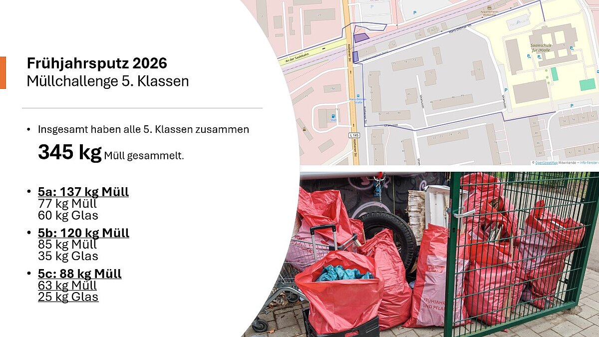 Die 5. Klassen der Saaleschule haben eine Müllchallenge initiiert, bei der alle Schülerinnen und Schüler der 5. Klassen gemeinsam beeindruckende 345 Kg Abfall im näheren Umfeld der Schule gesammelt haben.