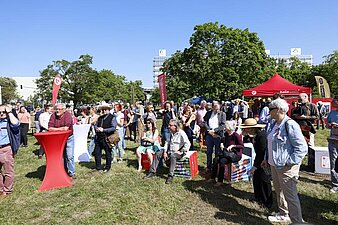 viele Besucher lauschen den Präsentationen auf der Bühne