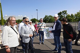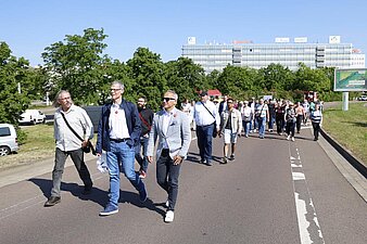 Viele Fußgänger laufen über die Brücke, vornweg Bürgermeister Egbert Geier und Mark Lange, Geschäftsführer der SMG
