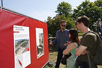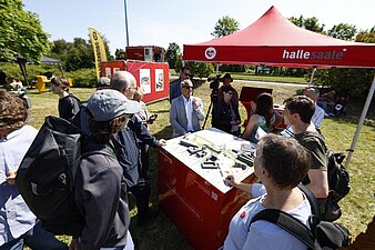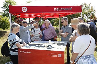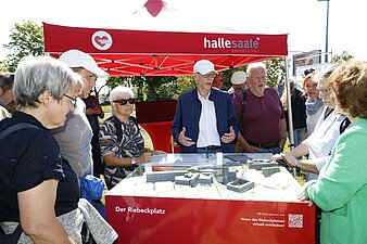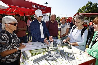 Mark Lange informiert interessierte Bürger am 3D-Modell über die Visionen zum Riebeckplatz
