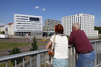 Ein Paar schaut von der Brücke in Richtung Neustadt