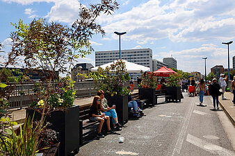 Bänke und Grünpflanzen auf der Brücke
