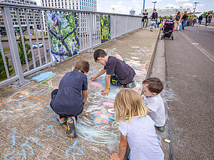Kinder malen mit Straßenmalkreide auf der Brücke