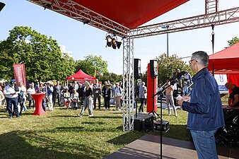 Bürgermeister Egbert Geier begrüßt die Besucherm die der Einladung zum Brückentag gefolgt sind
