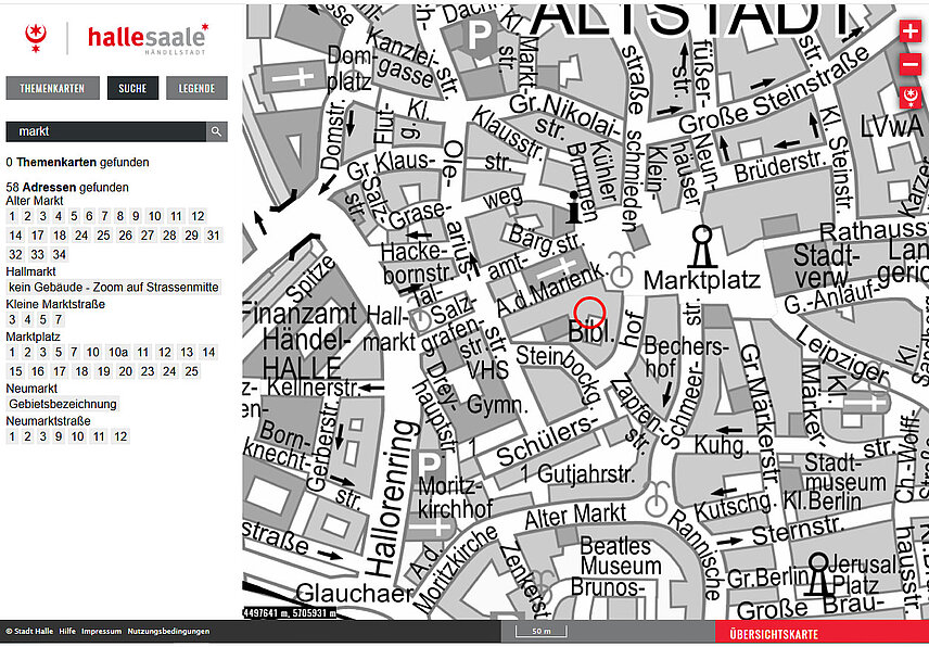 Über die Suche kann nach Straßennamen oder Points of Interest (POIs) gesucht werden. Als POIs gelten Orte, die für bestimmte Nutzer von besonderem Interesse sind. Hier ist auch die Eingabe von Wortrümpfen ist möglich. Bei der Eingabe von „markt“ werden zum Beispiel Adressen Alter Markt, Hallmarkt, Kleine Marktstraße, Marktplatz, Neumarktstraße mit den jeweils vorhandenen Hausnummern und die Gebietsbezeichnung Neumarkt gefunden. Treffer (z. B. Marktplatz 1) können direkt angeklickt werden und erscheinen in der Karte mit einem roten Kringel gekennzeichnet. Sobald man durch Zoomen den Kartenausschnitt verändert, verschwindet dieser Kringel.
