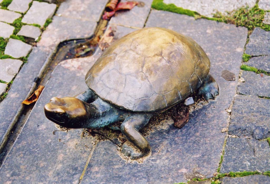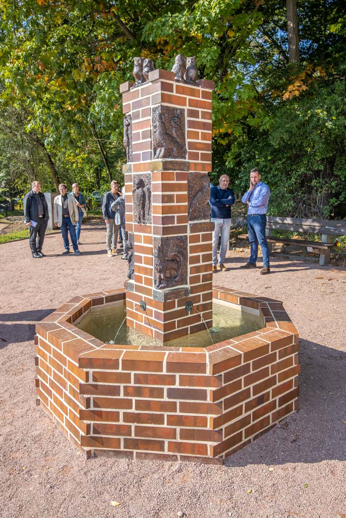 zum Brunnen: Brunnenstein mit Tiermotiven aus Granit und Bronze