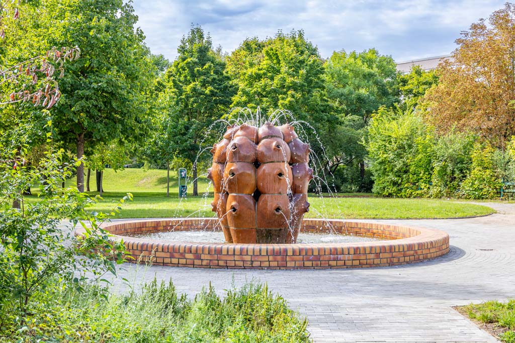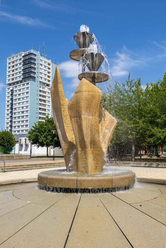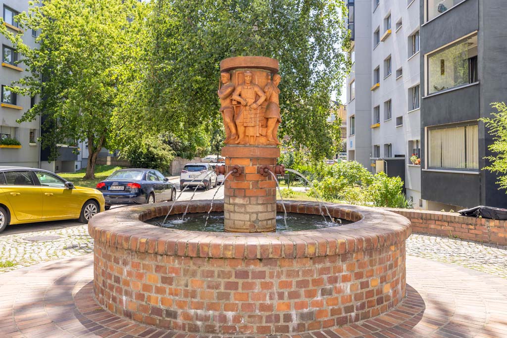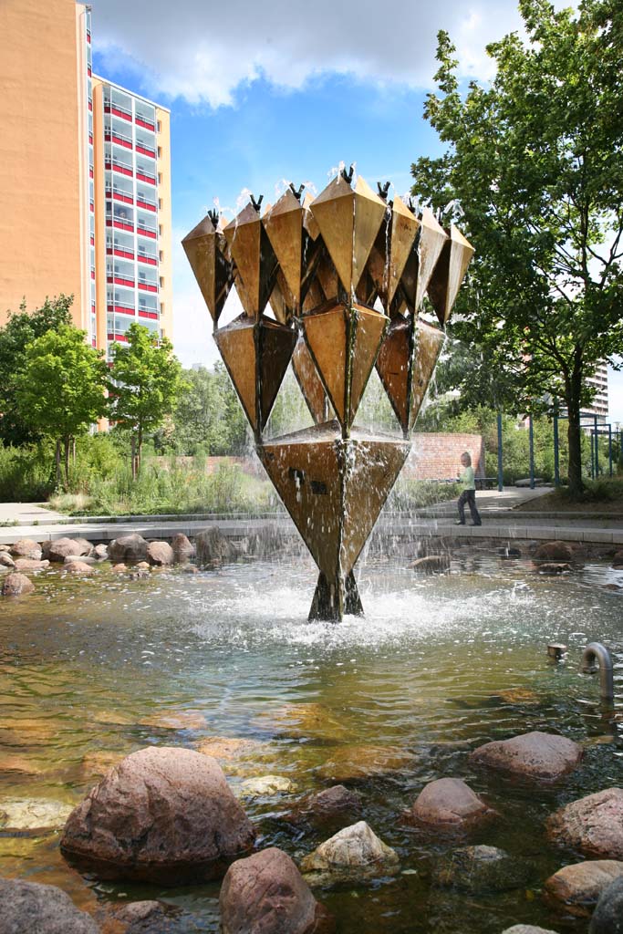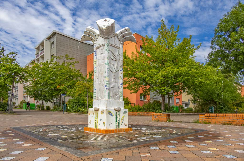 Bestandteil des Wohnungsbaus der 50er und 60er Jahre des vorigen Jahrhunderts war eine großzügige Freiflächengestaltung, zu der zahlreiche Brunnen zum Zweck der Wohnumfeldverbesserung gehörten. So wurde im Jahr 1964 in dem noch existierenden Teich eine Brunnenanlage integriert. Dazu wurde die Tiefe verringert. Nach einer grundhaften Erneuerung 1997 ist der Brunnen jetzt 45 cm tief und die Technik frostsicher installiert.