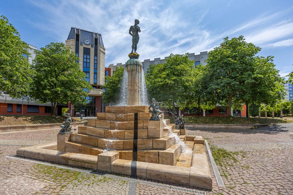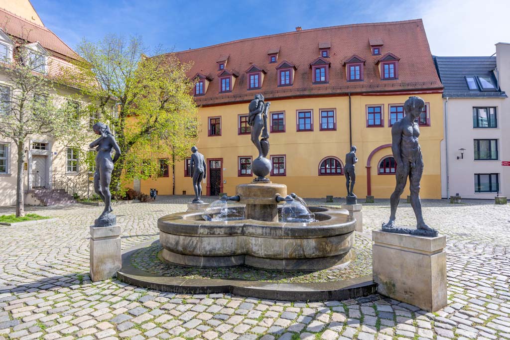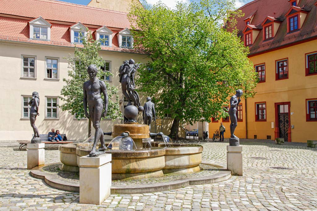 zum Brunnen: Bronzeplastik, Becken aus Thüringer Tavertin, 2022 Elektroanlage mit komplette Brunnensteuerung erneuert