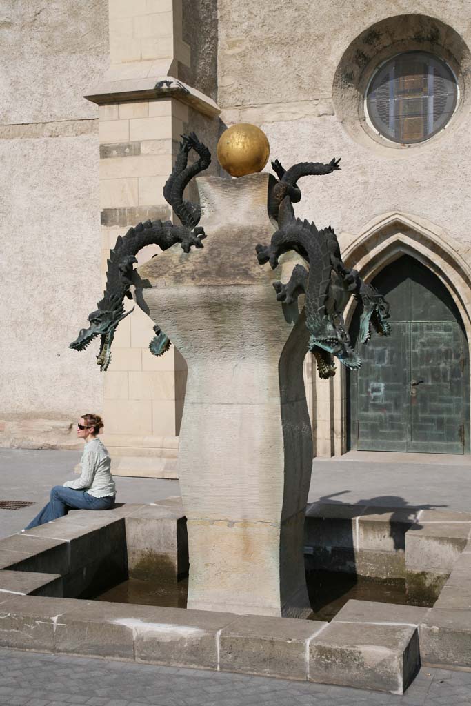 Der Drachenbrunnen wurde von Peter Michael entworfen und am Westportal der Marktkirche errichtet. Der Brunnen hat eine Höhe von 3,50 m.