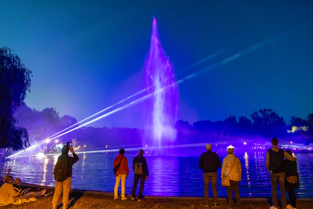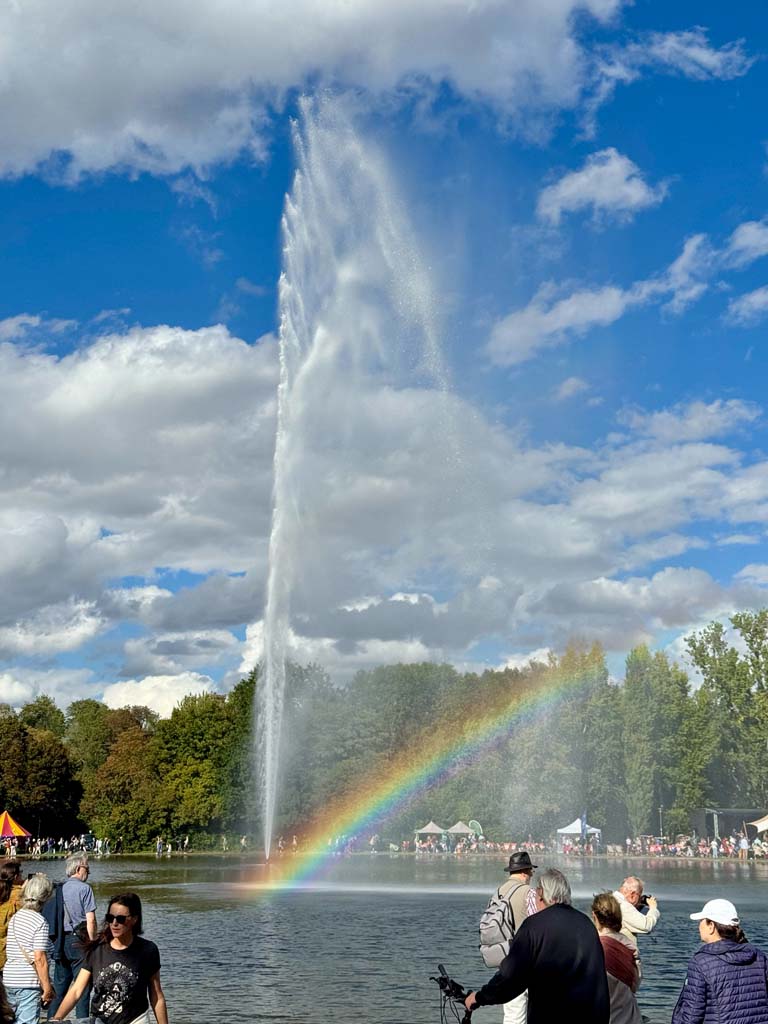 zum Brunnen: 80 m hohe Wasserfontäne,der Teich fasst über 25.000 m³ Wasser und ist 1,1 ha groß.