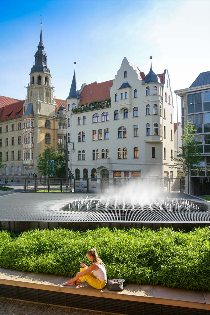 Das quadratische Düsenfeld aus gesägtem Naturstein (Basalt) von sechs mal sechs Metern am Endpunkt der neu gestalteten Fläche bildet den Blickfang beim Austritt aus der Passage und kann somit "Bühnencharakter" annehmen. Die Gestaltung soll die historische Bedeutung der Salzquellen und des Varietés für Halle aufgreifen. Die mit variierenden Kreisflächen gestaltete Wasserbühne nimmt die Kreisform der Düsentöpfe auf und löst die strenge Regelmäßigkeit der 36 Düsen auf. In den Kreisen mit einer maximalen Tiefe von ca. sechs Millimetern bleibt ein Wasserfilm stehen, der sich vom bewegten und fließenden Wasser abhebt. Assoziationen von Münzen - "Salztalern" können entstehen, die in der Wasserfläche liegen.