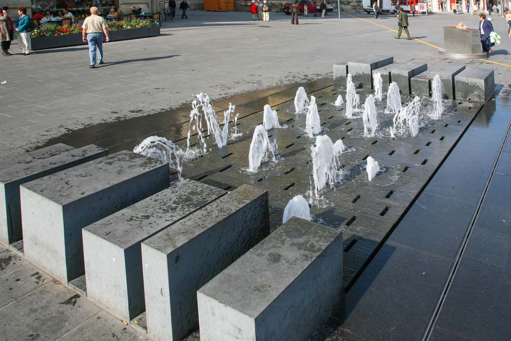Zum Brunnen: Die Brunnenanlage wurde 2004/2005 als Wasserspielbrunnen neu konzipiert.