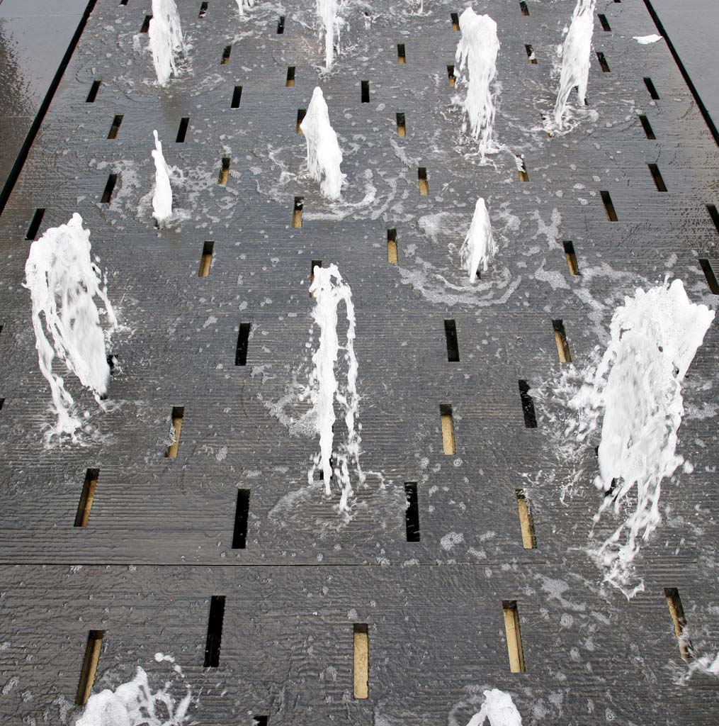 Zum Brunnen: Wasser-Lichtskulptur, 36 Düsen auf Feld von 6 x 6 m Natursteinplatten (Basalt) mit Edelstahlkanten