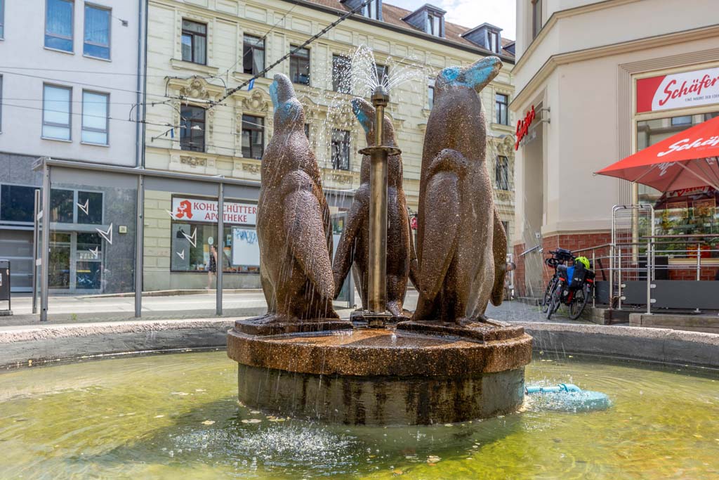 Der Eselsbrunnen steht in der Innenstadt am Alten Markt. Er wurde vom Künstler Heinrich Keiling (1856-1940) erschaffen. Seine Schale wurde 1906 und die Figur 1913 errichtet. Der Brunnen ist eine Schale aus Stampfbeton mit Masken als Wasserspeiern am Rande. In der Mitte ragt eine Säule empor, auf deren Plattform die zierliche Gruppe „Der Esel, der auf Rosen geht“ aus Bronze steht. Der Möbelkaufmann Martick stiftete 1905 für eine neue Anlage 3.500 Mark als Austausch für einen 1868 aufgestellten Zinkbrunnen. Im Zuge der 1997 stattgefundenen Renovierung ist die 92 cm große Figur von Ulrich Seiblist restauriert worden. Das Brunnenbecken wurde von Peter Michael und Christoph Reichenbach restauriert.