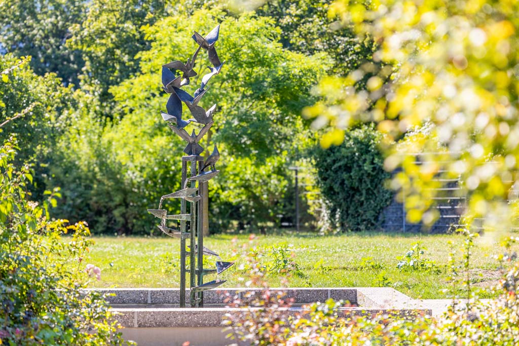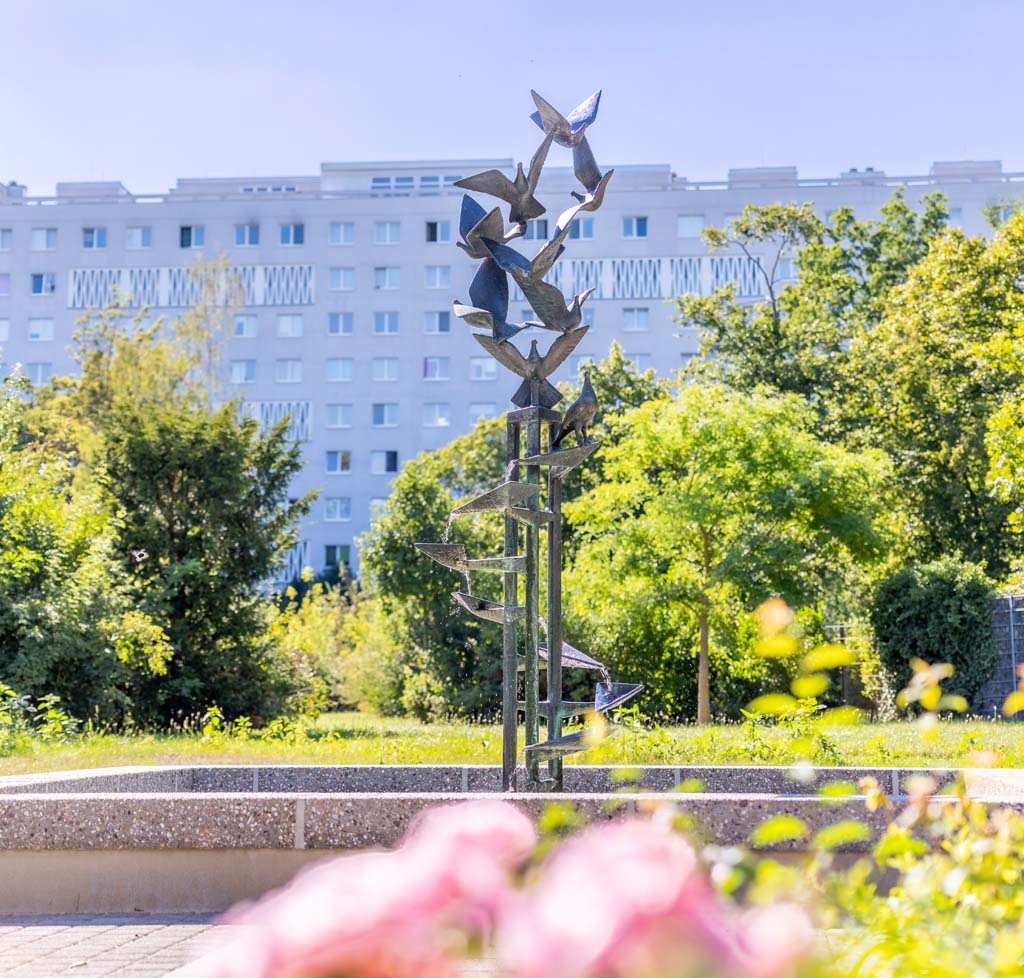 Zum Brunnen: Brunnenanlage mit filigraner Bronzeplastik, einen Schwarm von neun auffliegenden Friedenstauben darstellend.