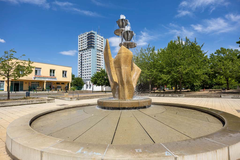 Der Brunnen war seit rund 16 Jahren außer Betrieb. Passend zum 60. Jahrestag der Grundsteinlegung von Halle-Neustadt wurde die Sanierung des Taubenbrunnens, westlich des Zollrains abgeschlossen.