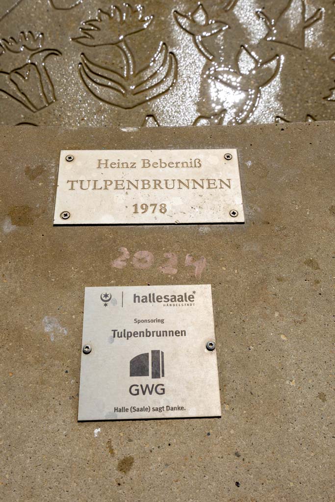 2023 erfolgte durch eine notwendige Fernwärmetrassen-sanierung der komplette Rückbau der gesamten Brunnenanlage mit umlaufender Brunnenpflasterfläche. Die Steinmetzwerkstatt Korger hatte die große Aufgabe mit höchster Präzision und zur vollsten Zufriedenheit des Künstlers Herr Weihe umgesetzt und nach einem Jahr wieder am selbigen Standort aufgebaut.
