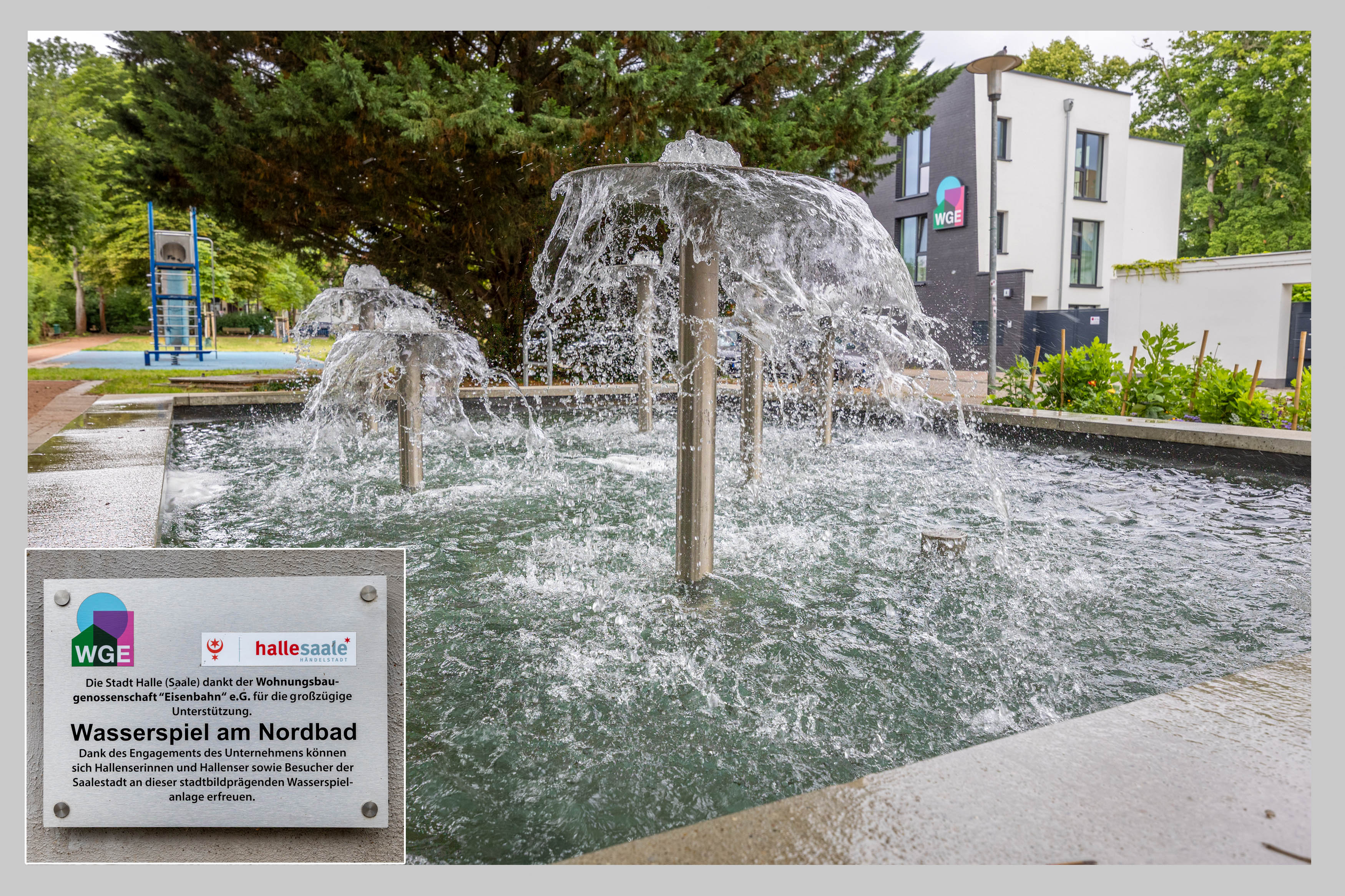 Bestandteil des Wohnungsbaus der 50er und 60er Jahre des vorigen Jahrhunderts war eine großzügige Freiflächengestaltung, zu der zahlreiche Brunnen zum Zweck der Wohnumfeldverbesserung gehörten - so auch dieser Brunnen am Nordbad. Das Wasserspiel wurde 2003 restauriert, 2017 wurde die komplette Wassertechnik aus Edelstahl erneuert. 2024 erfolgte eine Sanierung des Brunnenbeckens mit neuer Brunnenrandabdeckung.