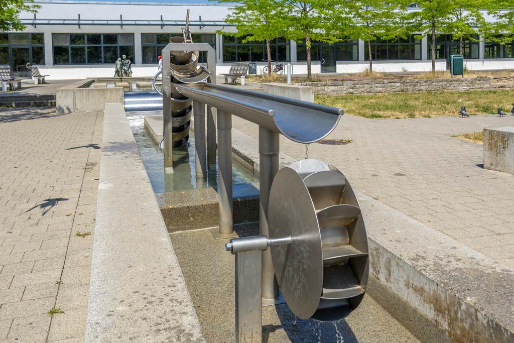 Wasserspielanlage mit 3 Schöpfrädern, Wasserspirale, Mühlrad und 2 Stauklappen, 4 Bänke, 6 Hockerbänke, 5 Müllbehälter