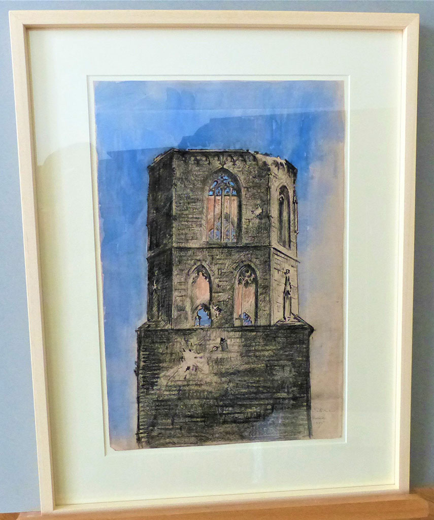 Ein Aquarell des Architekten Walter von Fritschen (1894-1967) zeigt den Roten Turm ohne seinen charakteristischen Helm. Fritschen wohnte seit Beginn des Jahres 1945 bei Verwandten in Halle und fertigte mehrere Zeichnungen zu Bombenschäden im Stadtbild Halles an.