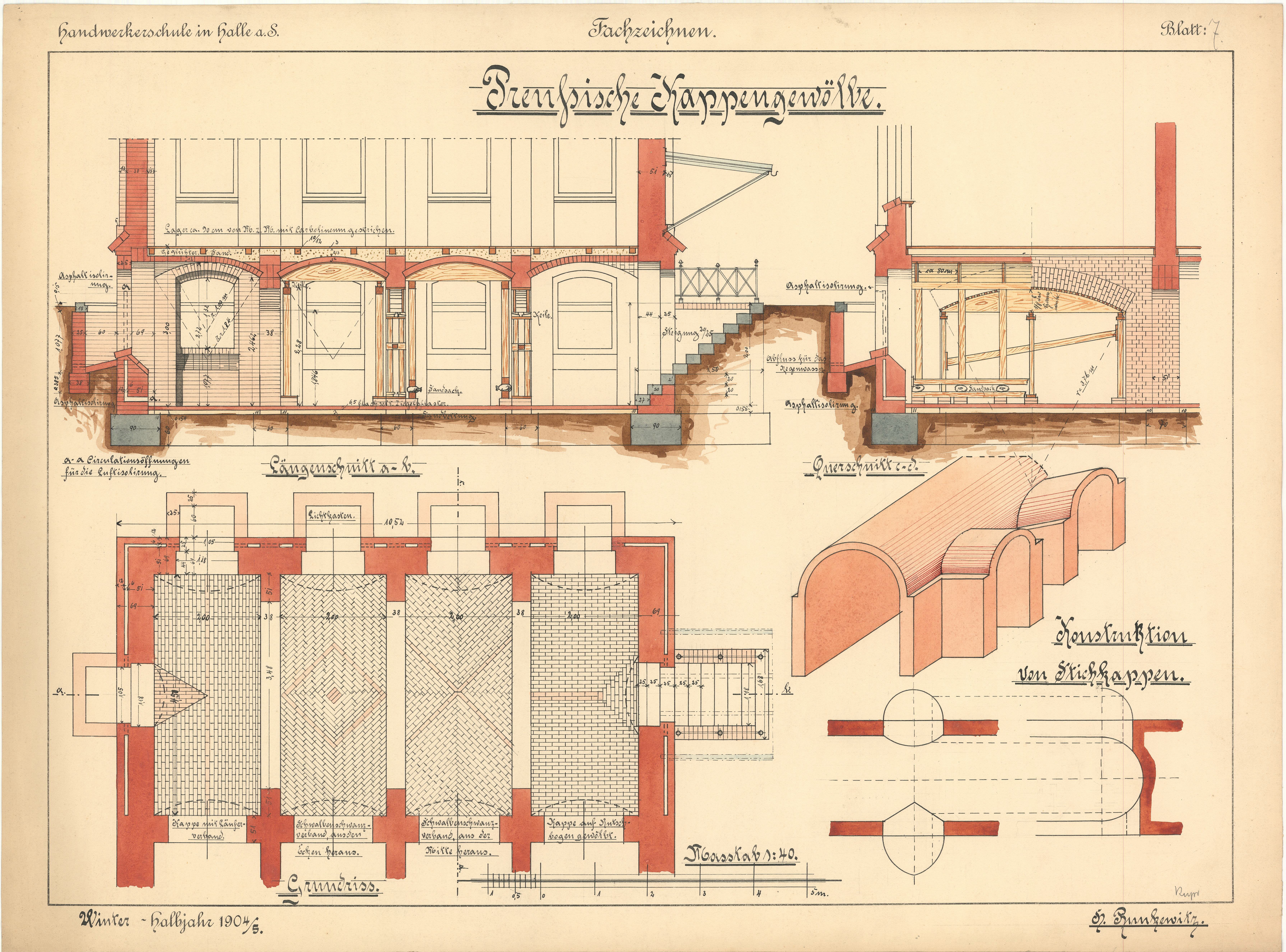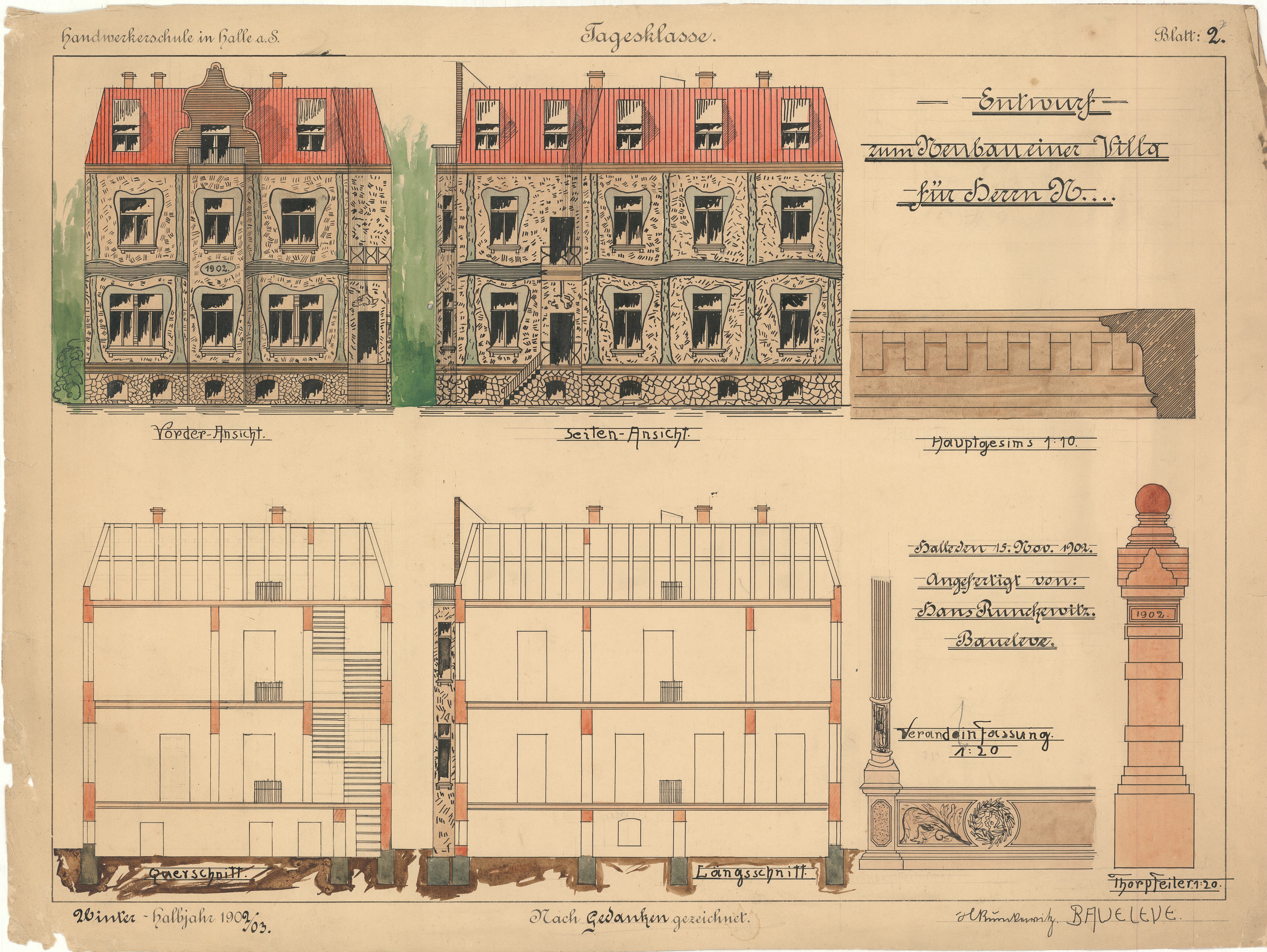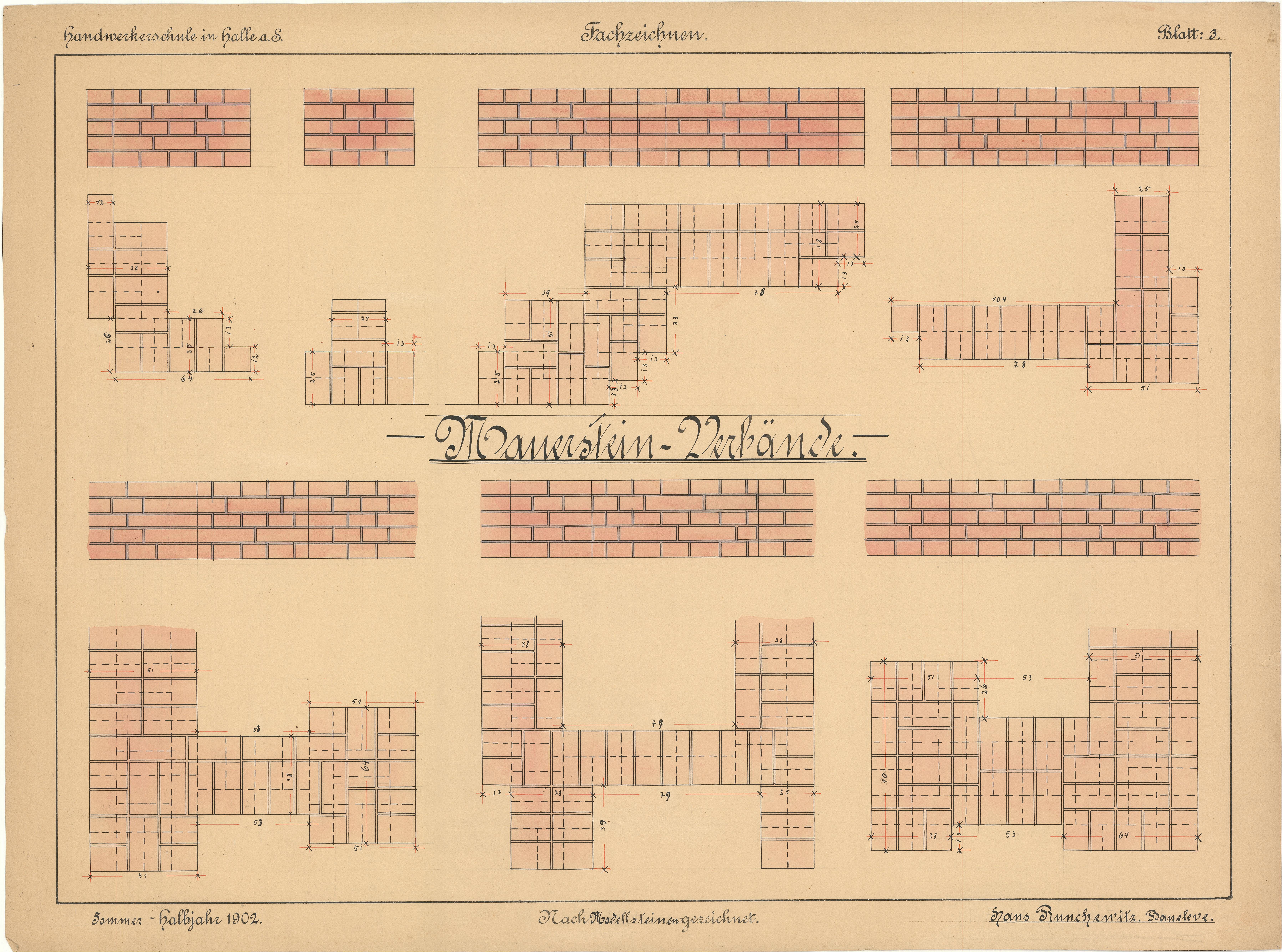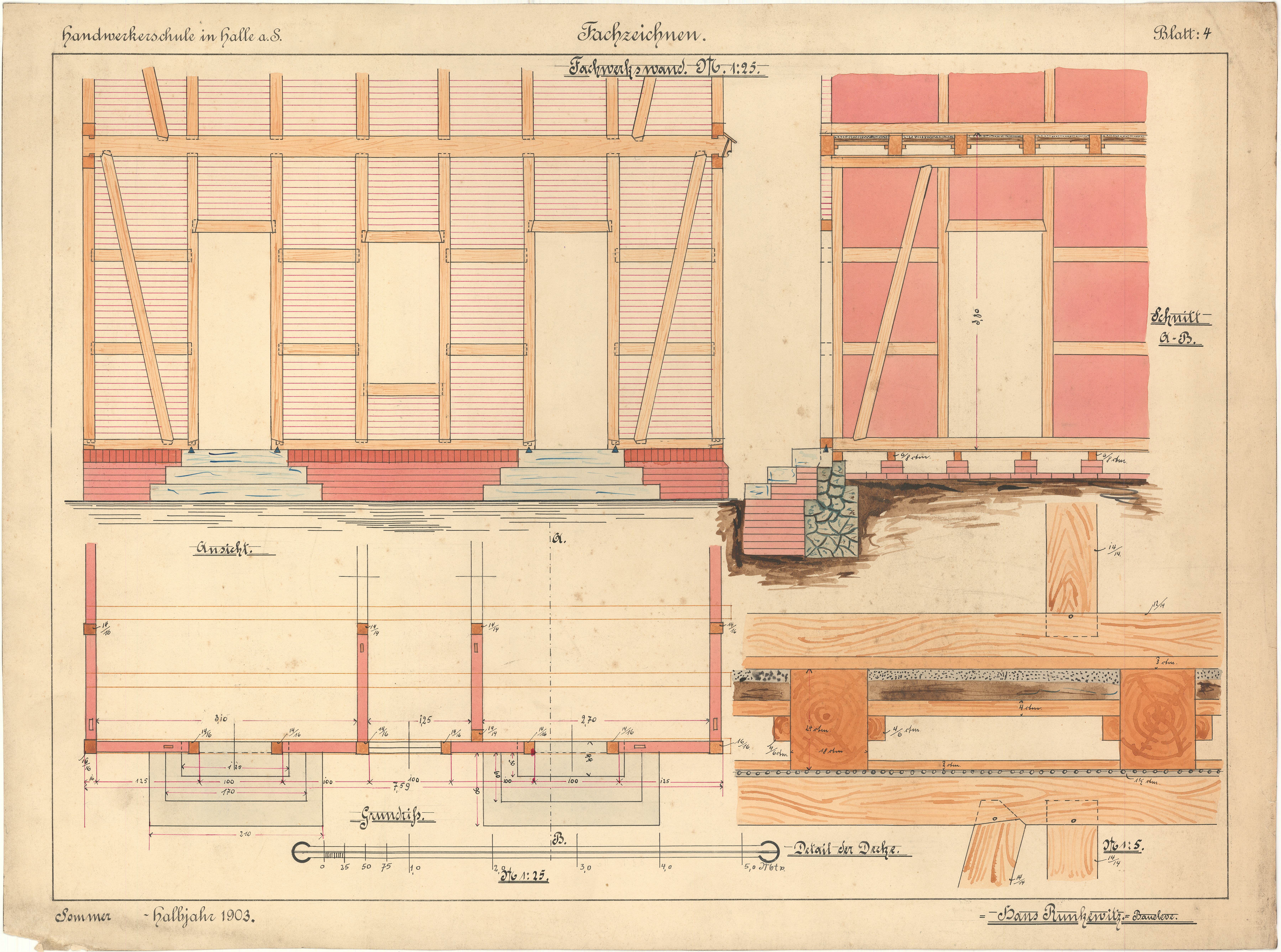 Einer der ersten Schüler der neuen Schule war Johannes Runckewitz (1886 -1956). Der Sohn eines Glasermeisters absolvierte 1901-1905 eine Ausbildung für eine spätere Tätigkeit im Bauwesen. Auf dem Lehrplan standen unter anderem Baukonstruktionslehre, Geometrie, Materialkunde, Buchführung und Zeichnen. Über 90 Zeichnungen dokumentieren die von Runckewitz im Fachzeichnen erworbenen Fertigkeiten. Er beherrschte die Darstellung von geometrischen Figuren, Mauerverbänden und Gewölbeformen ebenso wie Entwurfszeichnungen für ein Haus.