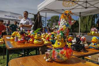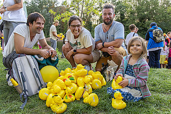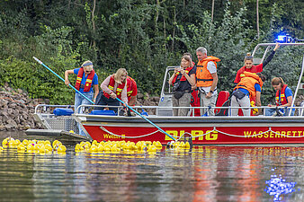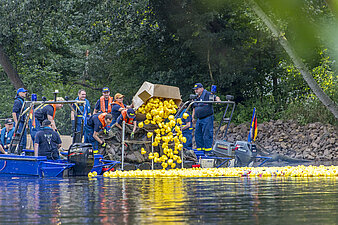 Die Enten werden zum Rennen ins Wasser gelassen.