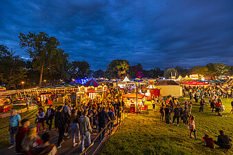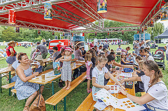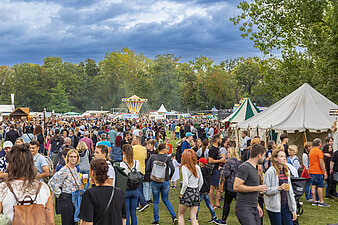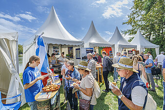Besucherinnen und Besucher probieren Essen vom finnischen Stand im Städtepartnerschaftsdorf.