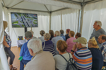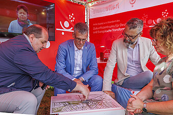 Gäste aus der Partnerstadt Karlsruhe schauen sich die Pläne zum Zukunftszentrum an.