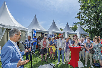 Bürgermeister Egbert Geier begrüßt Gäste am Städtepartnerschaftsdorf