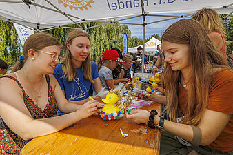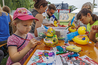 Kinder und Jugendliche schmücken Enten für den Schönheitswettbewerb.