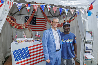 Bürgermeister Geier mit einem Gast am Stand von Savannah (Georgia, USA) im Städtepartnerschaftsdorf.