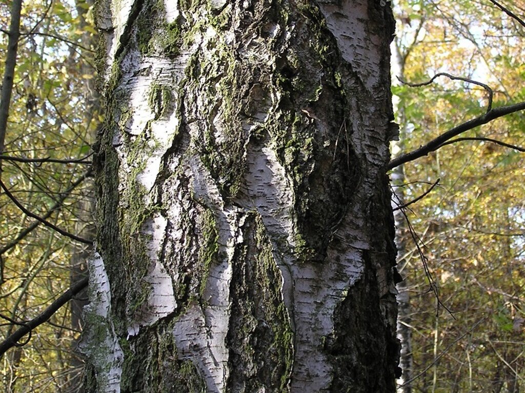 - 20 bis 30 Meter hoher Baum mit weiß abblätternder, im Alter rauher, schwarzrissiger Borke und später hängenden Zweigen