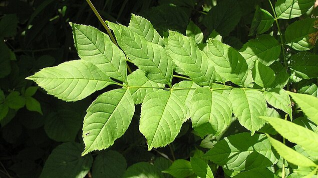 - gegenständige, 20 bis 30 Zentimeter lange unpaarig gefiederte Blätter mit sieben bis elf Fiederblättern (4 bis 10 Zentimeter lang, 2 bis 3 Zentimeter breit, ungestielt, nur Endfiederblatt lang gestielt, unterseits entlang der Adern wollig rotbraun behaart)