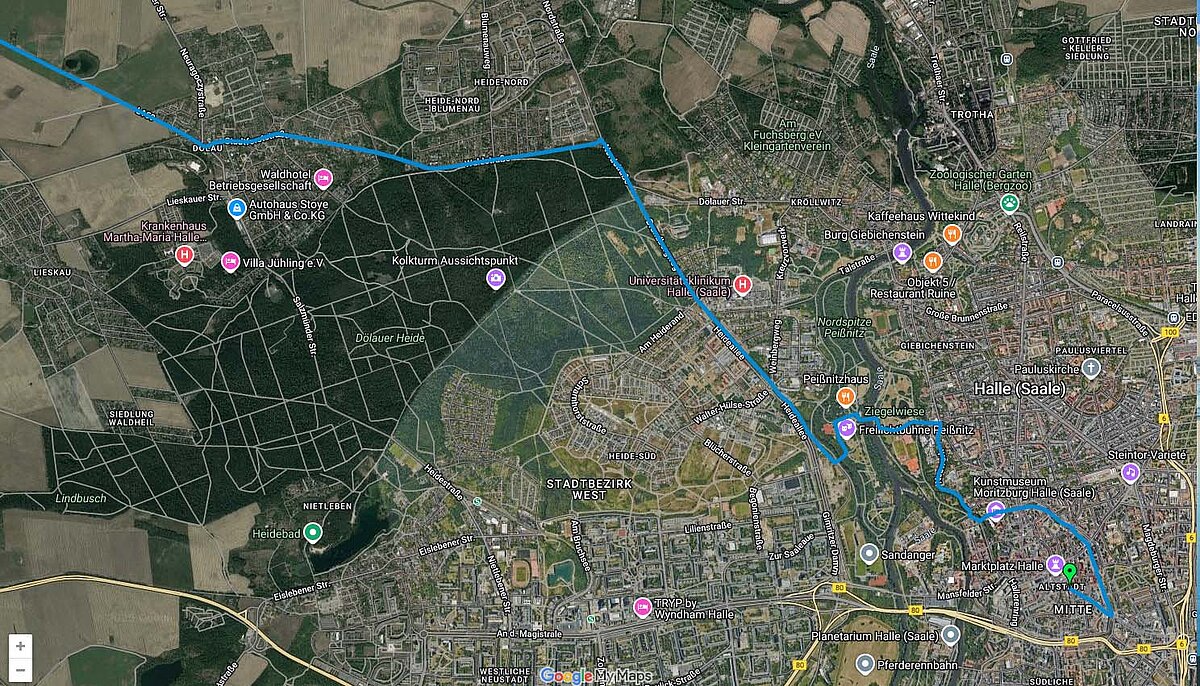 Der Bereich zwischen Burg Giebichenstein sowie Reileck und Marktplatz über Burgstraße, Mühlweg, Bernburger Straße und Große Ulrichstraße kann in der Zeit von 13:30 Uhr bis 15:00 Uhr nicht bedient werden.