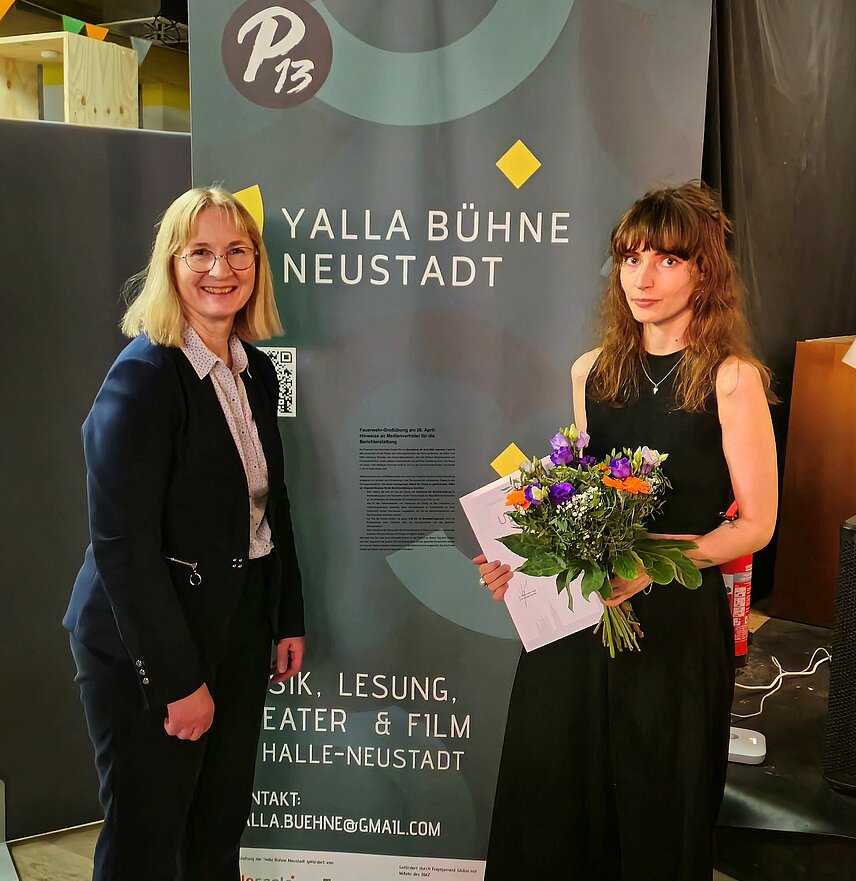 (halle.de/ps) Die Antrittslesung der neuen Stadtschreiberin Lara Rüter haben am Mittwoch, 16. April 2024, zahlreiche Besucherinnen und Besucher im soziokulturellen Stadtteilzentrum Passage 13 in Neustadt verfolgt. Die Veranstaltung fand auf der Yalla-Bühne statt, dem kulturellen Herzstück der Passage 13. Moderator André Schinkel, Stadtschreiber 1998/1999, langjähriger Wahl-Hallenser und in der Stadt bekannter Autor, führte durch das Programm und vermittelte dem Publikum so einen Eindruck von Lara Rüters Persönlichkeit und literarischem Schaffen. Die Lyrikerin Lara Rüter fesselte das Publikum mit ihrer charakteristischen Mischung aus sprachlicher Eleganz, poetischer Finesse und saloppen, modernen Elementen sowie popkulturellen Referenzen. Ihr authentischer Auftritt begeisterte das Publikum. Als Stadtschreiberin plant Lara Rüter in den kommenden Monaten, die Stadtgesellschaft durch generationenübergreifende Schreibworkshops einzubinden und literarisch zu aktivieren. „Jeder Mensch hat eine Stimme“, so Rüter.