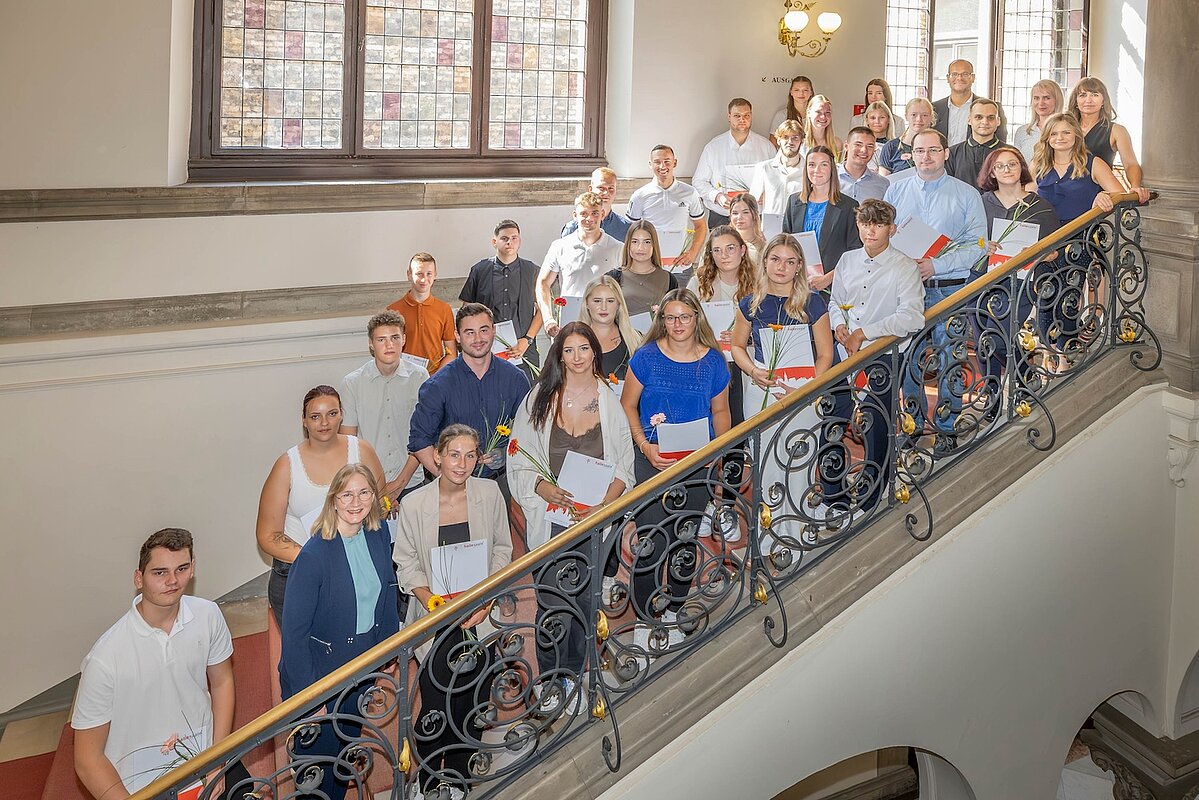 (halle.de/ps) Mit einem Festakt wurden die neuen Auszubildenden und dual Studierenden der städtischen Verwaltung am heutigen Donnerstag, 1. August 2024, im Großen Saal des Stadthauses am Marktplatz begrüßt. Die Beigeordnete für Kultur und Sport, Dr. Judith Marquardt, und der stellvertretende Fachbereichsleiter Personal, Jörn Heinrich, begrüßten die neuen Kolleginnen und Kollegen. In diesem Jahr beginnen 28 Auszubildende ihr Berufsleben bei der Stadt Halle (Saale), darunter 20 angehende Verwaltungsfachangestellte in der Fachrichtung Kommunalverwaltung. Die Zahl von 27 und 25 Auszubildenden aus den vergangenen Jahren konnte somit nochmals gesteigert werden. Ihr duales Studium in der öffentlichen Verwaltung, Verwaltungsökonomie und der sozialen Arbeit beginnen in diesem Herbst sieben Berufsanfängerinnen und Berufsanfänger. Mit dem Festakt wurden gleichzeitig sechs Auszubildende und zwei dual Studierende ins Berufsleben bei der Stadtverwaltung verabschiedet.