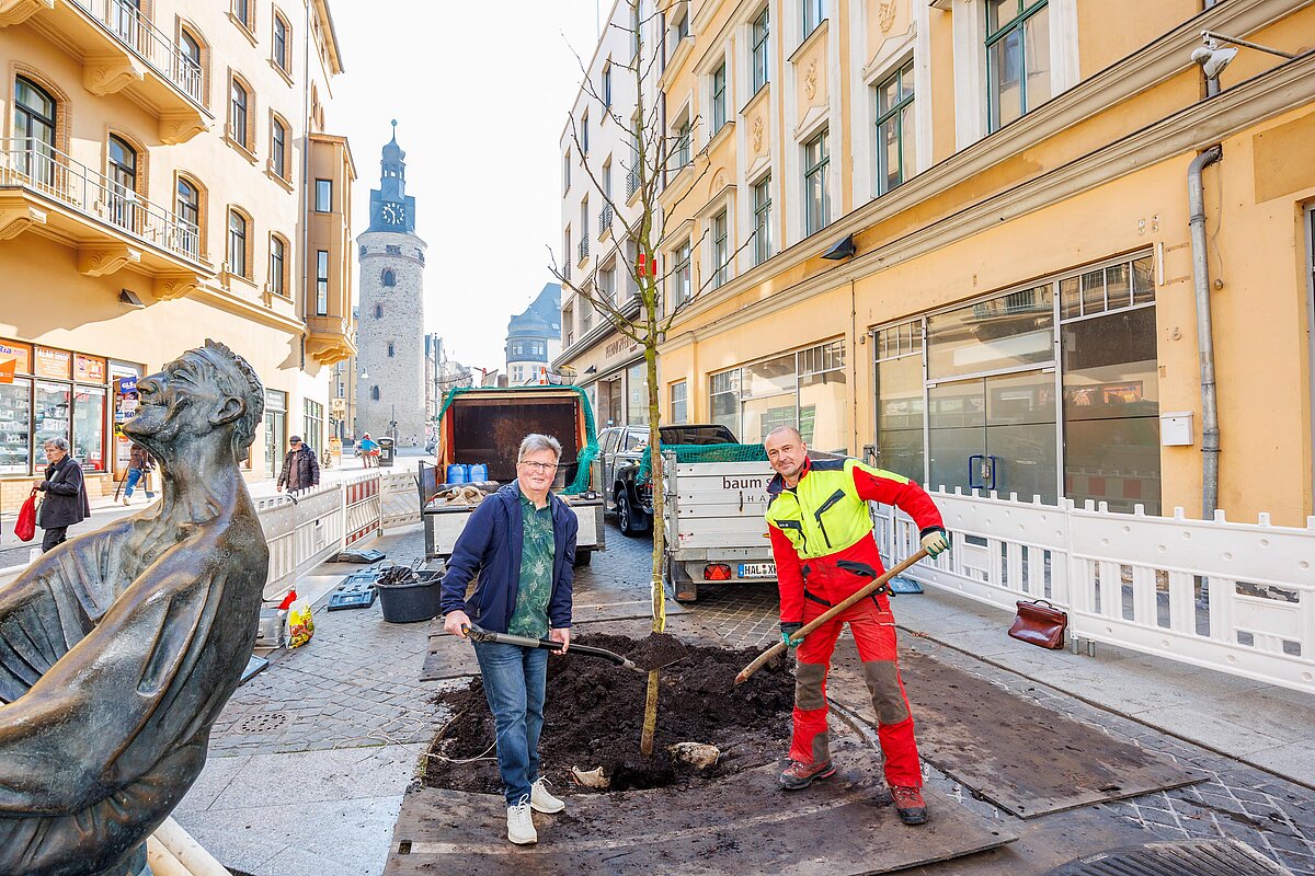 (halle.de/ps) Dank einer Bürgerspende hat die Stadt am Zither-Reinhold-Brunnen in der Leipziger Straße einen neuen Baum gepflanzt: Dr. Gerald Lange hatte Oberbürgermeister Dr. Alexander Vogt im Sommer 2025 angeboten, für diesen Standort einen Baum zu spenden und dies auch realisiert. „Wir sind seit 45 Jahren begeisterte Hallenser und möchten der Stadt gern etwas zurückgeben“, so Baum-Sponsor Lange, der bei der Pflanzung am heutigen Donnerstag, 5. März 2026, dabei war. Nachdem der Stadtrat im Dezember die Spende in Höhe von 2.700 Euro angenommen hatte, wurde im Auftrag der Stadt pünktlich nach der Winterpause ein Gelber Lederhülsenbaum (Gleditsia triacanthos „Sunburst“) durch die Firma Baumservice Halle gepflanzt. Bereits im Herbst war die Pflanzgrube vorbereitet und mit Substrat und Erde gefüllt worden.