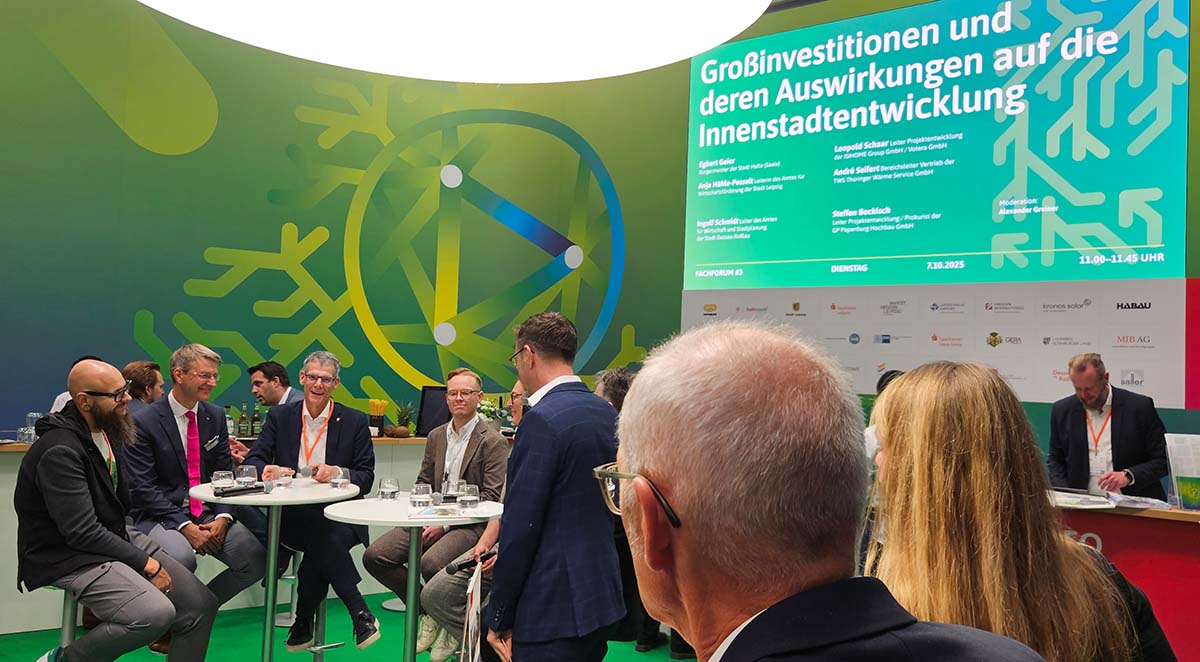 Im Rahmen des Fachforums „Großinvestitionen und deren Auswirkungen auf die Innenstadtentwicklung“, das am Dienstagvormittag auf der Messe stattfand, erläuterte Halles Bürgermeister Egbert Geier die Bedeutung des Riebeckplatzes als Schlüsselraum der Transformation. Im Podium diskutierten zudem Anja Hähle-Posselt (Leiterin des Amtes für Wirtschaftsförderung der Stadt Leipzig), Ingo Schmidt (Leiter des Amtes für Wirtschaft und Stadtplanung der Stadt Dessau-Roßlau), Leopold Schaar (Leiter Projektentwicklung ISIHOME Group / Votera GmbH), André Seifert (Bereichsleiter Vertrieb TWS Thüringer Wärme Service GmbH) sowie Steffen Bociksch (Leiter Projektentwicklung / Prokurist GP Papenburg Hochbau GmbH). Moderiert wurde das Gespräch von Alexander Greiner.