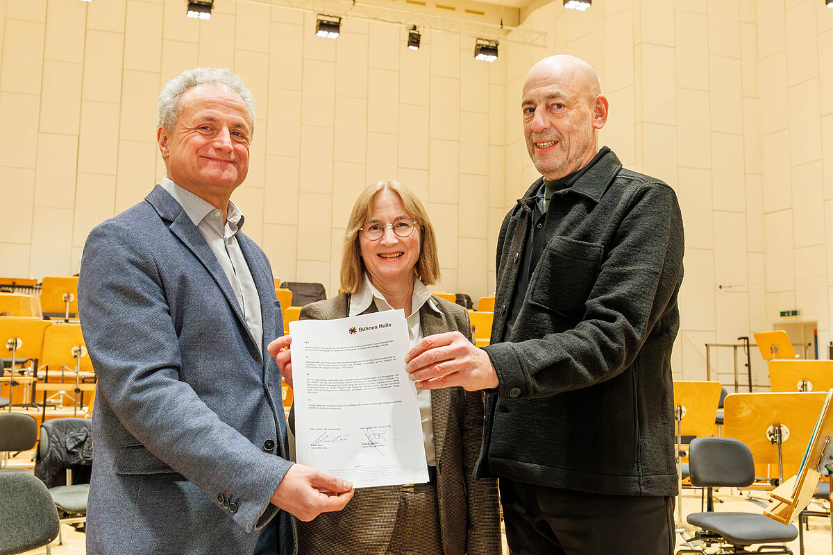 (halle.de/ps) Fabrice Bollon bleibt Generalmusikdirektor und Chefdirigent der Staatskapelle und Oper Halle. Nachdem der Aufsichtsrat der Theater, Oper und Orchester GmbH Halle (TOOH) einstimmig die Verlängerung des Vertrags beschlossen hatte, haben am Donnerstagabend, 8. Januar 2026, TOOH-Geschäftsführer Klaus Dörr und Fabrice Bollon in Anwesenheit der Beigeordneten für Kultur und Sport, Dr. Judith Marquardt, den neuen Dienstvertrag unterzeichnet. Er beginnt zur Spielzeit 2027/2028 und gilt bis zum 31. Juli 2032.